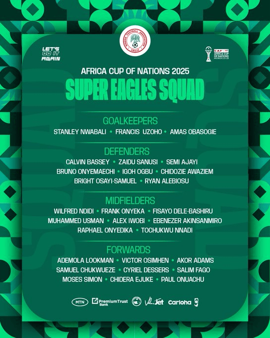 虎扑12月11日讯尼日利亚公布了非洲杯参赛大名单,奥斯梅恩领衔,卢克曼、伊沃比、楚克乌泽在列。